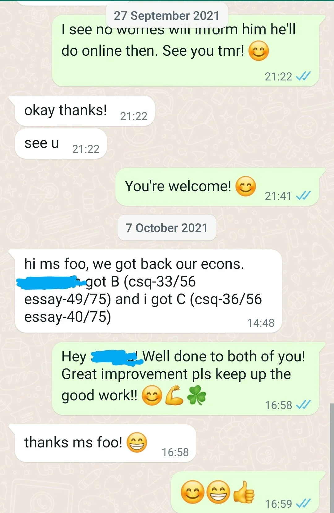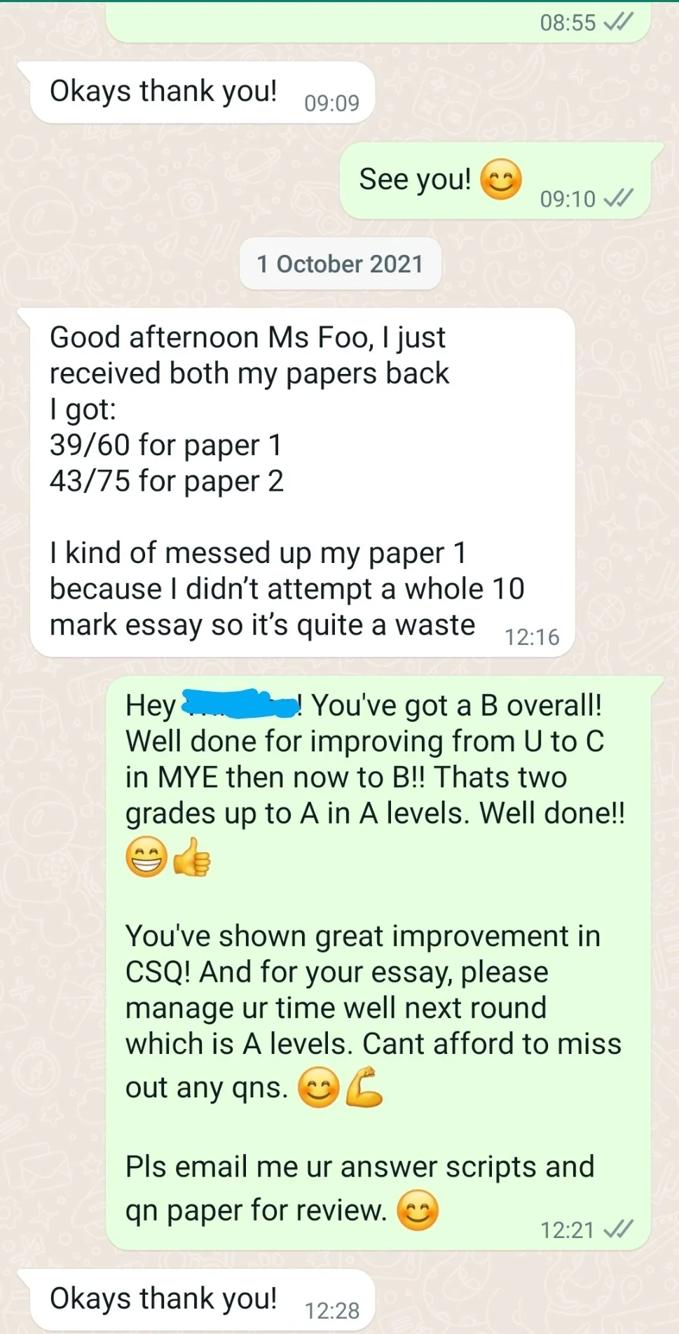Understanding of content forms the basic foundation for students to do well, followed by exam techniques such as question analysis and answer structure. Not forgetting Ms Foo’s constant reminder to her students to include “scope and depth” in their answers. Applying what is taught by Ms Foo is key to seeing improvement in students’ results, not forgetting students’ hard work in studying.