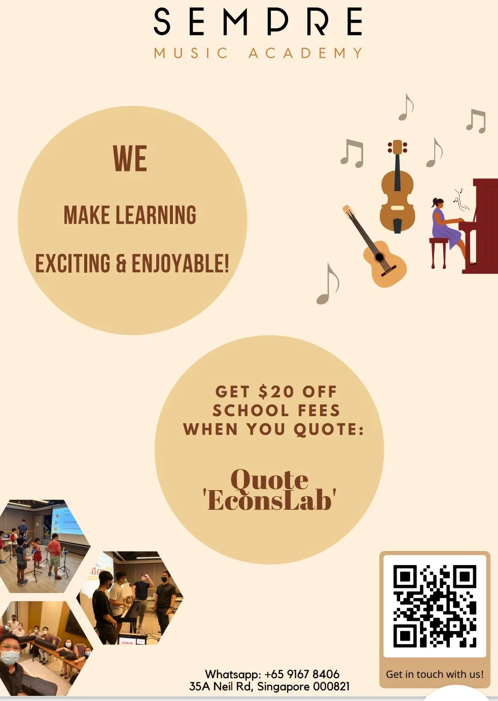 Interested to find out more about music lessons at Sempre Music Academy? Contact Sempre for more information. Do not forget to quote “EconsLab” to enjoy your special privilege.