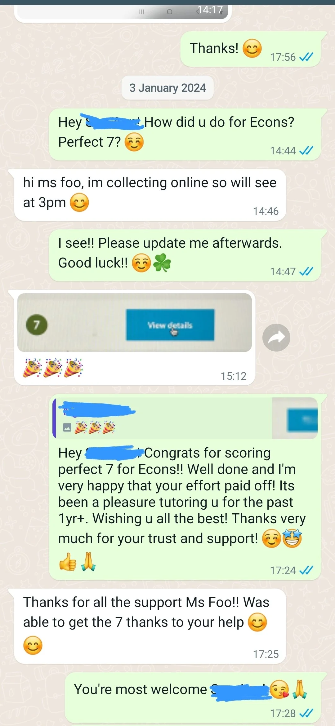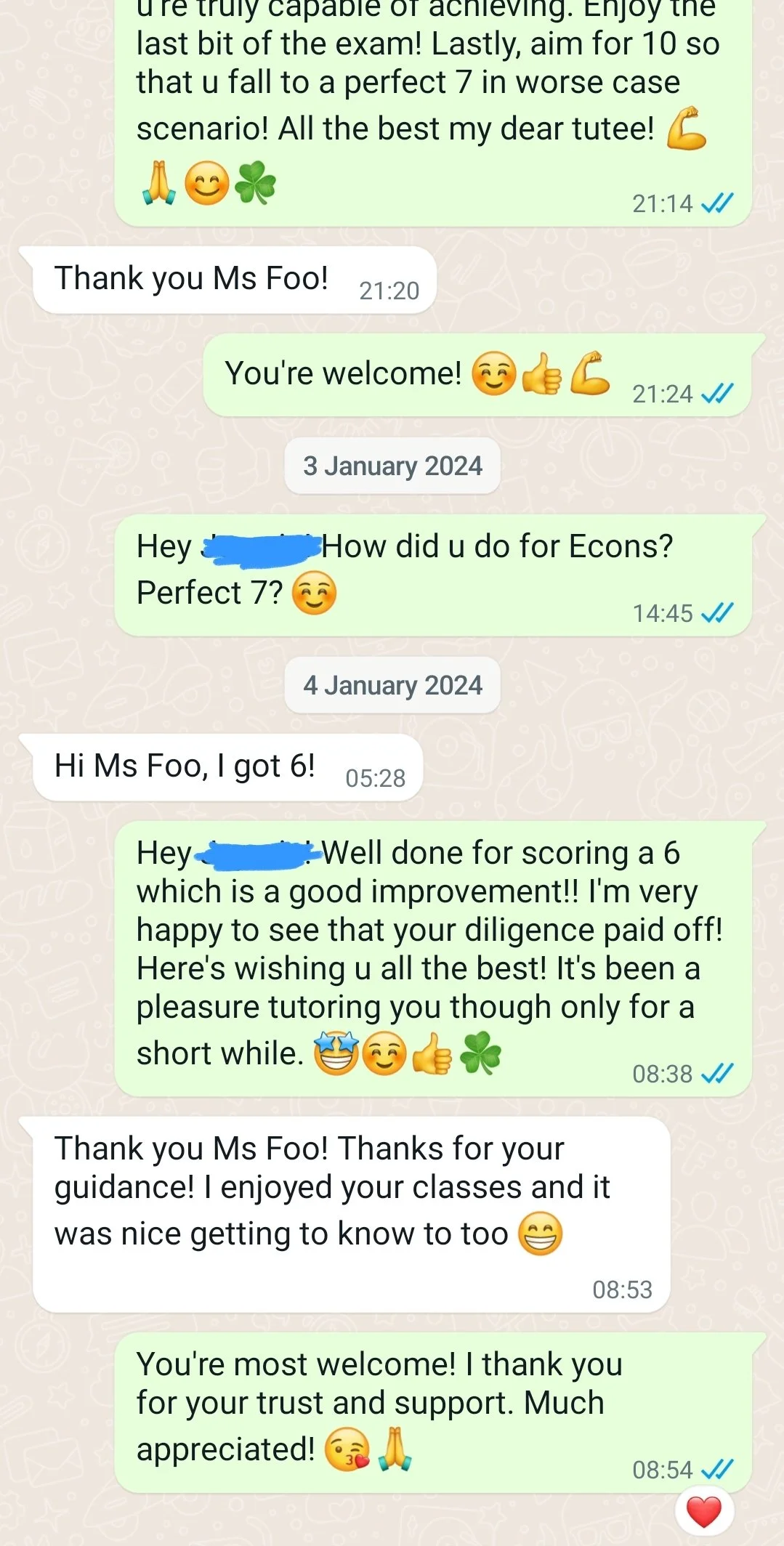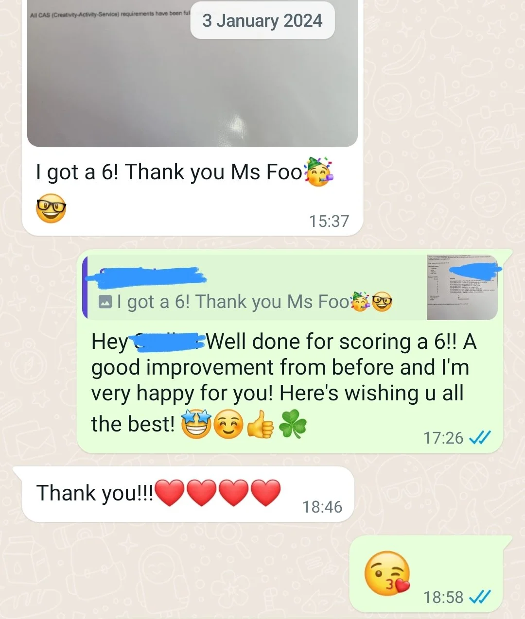 “Ms Foo helped bring my grade up from a 5 to 7! What I love is not just that she cares a lot about each student, making sure everyone understands the concepts being taught and encouraging students to clarify their doubts, but also the way she teaches. She teaches us the ways to think about answering essay questions rather than just giving us the content answers, making the knowledge she teaches us in class applicable to almost any question. Thank you Ms Foo!” ~ Lucas Woon, SOTA