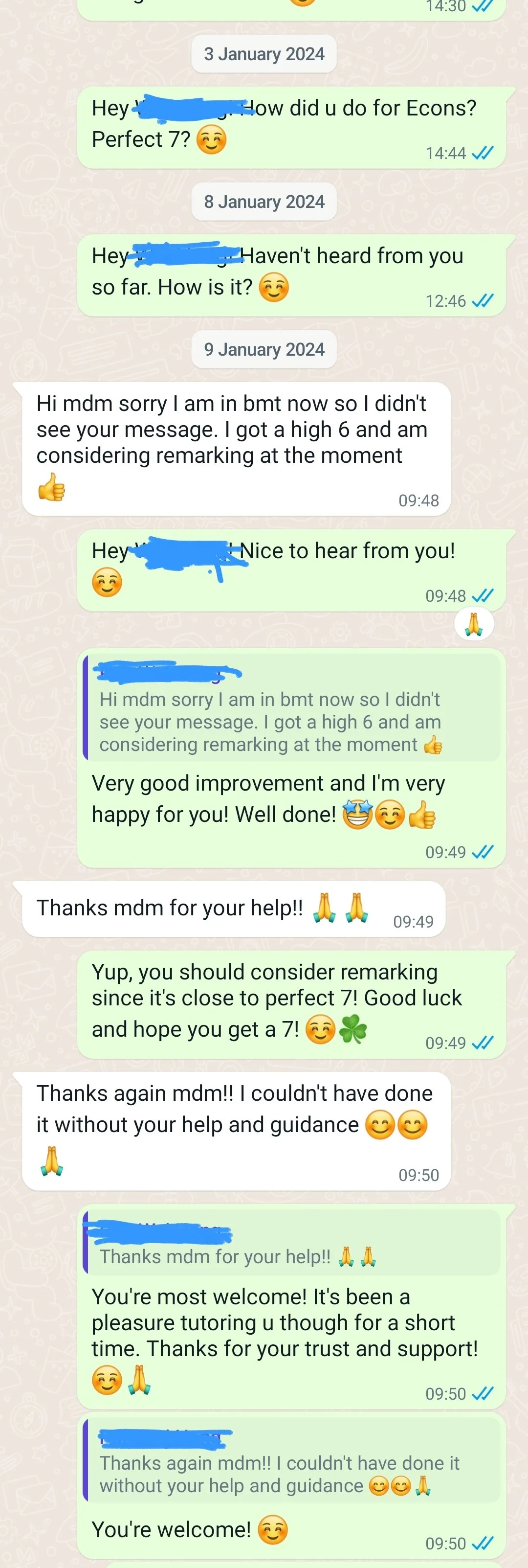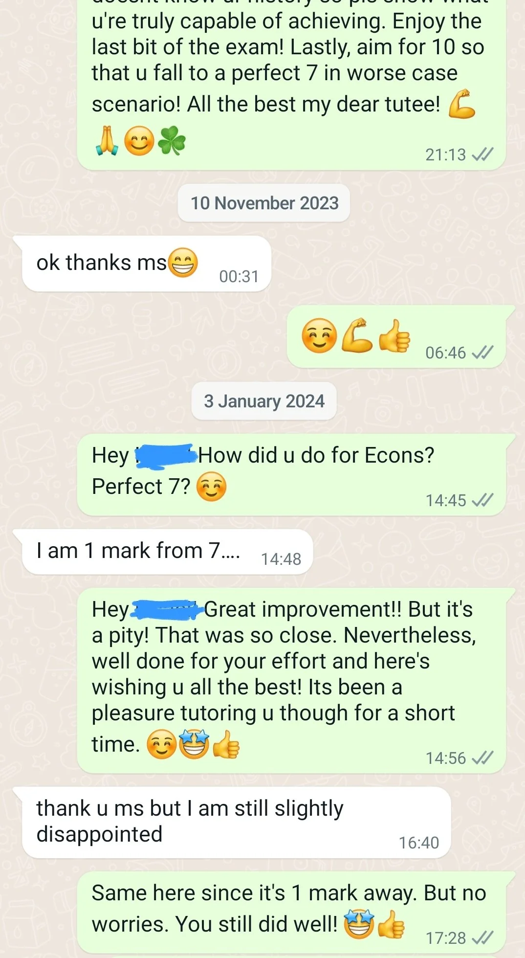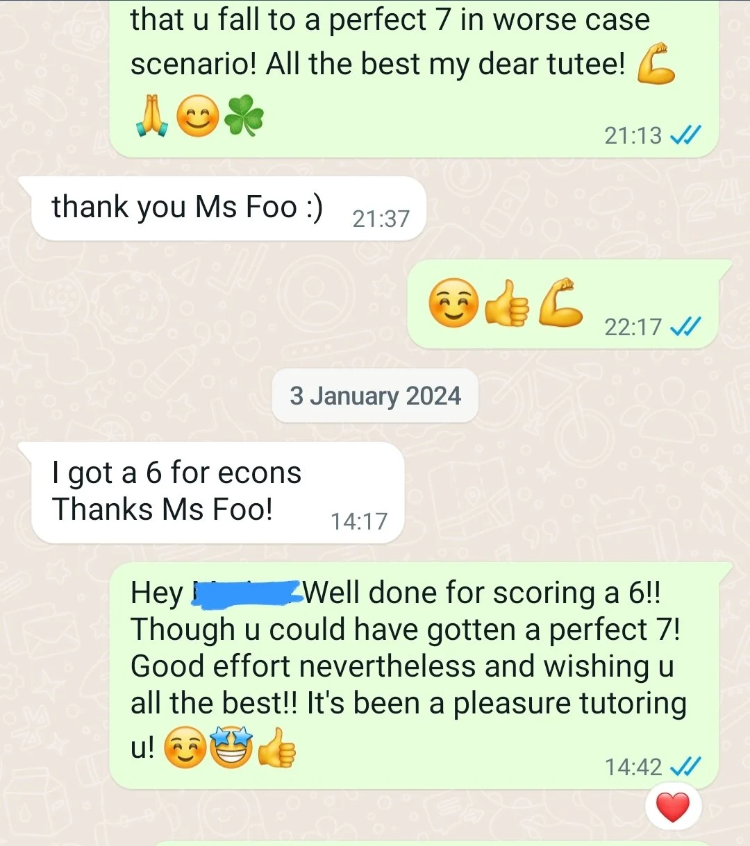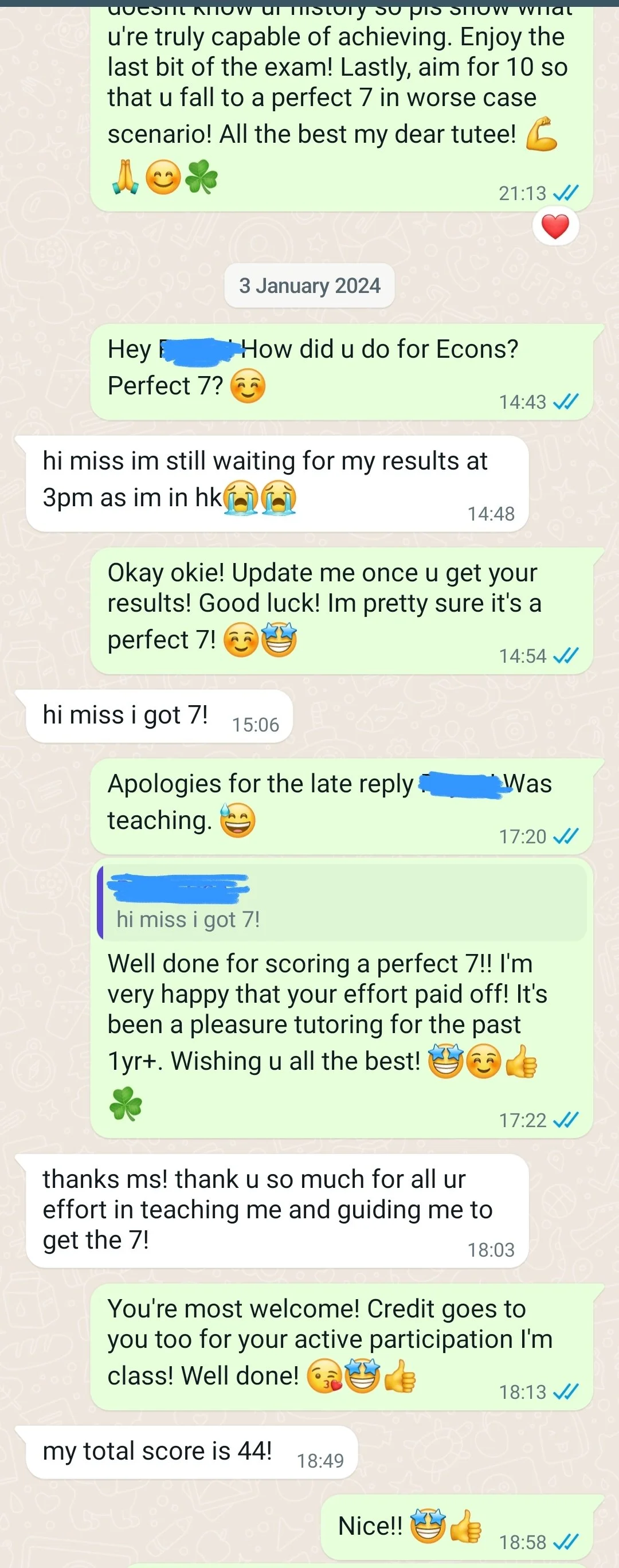 “Ms Foo helped bring my grade up from a 5 to 7! What I love is not just that she cares a lot about each student, making sure everyone understands the concepts being taught and encouraging students to clarify their doubts, but also the way she teaches. She teaches us the ways to think about answering essay questions rather than just giving us the content answers, making the knowledge she teaches us in class applicable to almost any question. Thank you Ms Foo!” ~ Lucas Woon, SOTA