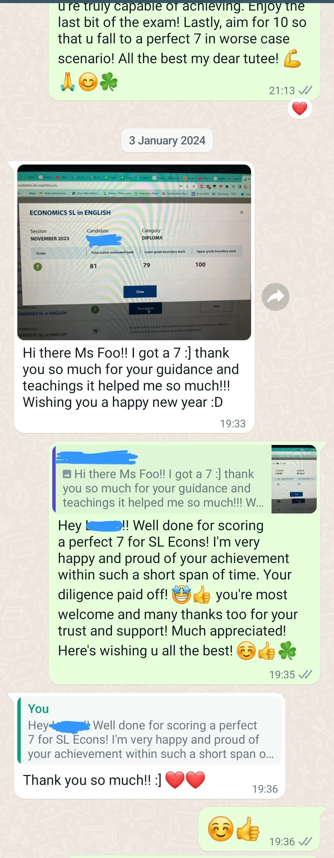 “Ms Foo has helped me so much during my IB journey as her lessons are engaging and helped me better understand Econs alongside its real world applications. Thanks to her patience and good explanations I managed to clarify any doubts I had about the content both in lesson and even outside lessons during my own revision time. I was able to secure good scores for both prelims and my IB exams. Thanks again Ms Foo!” ~ Ng Sue Ann, ACS International